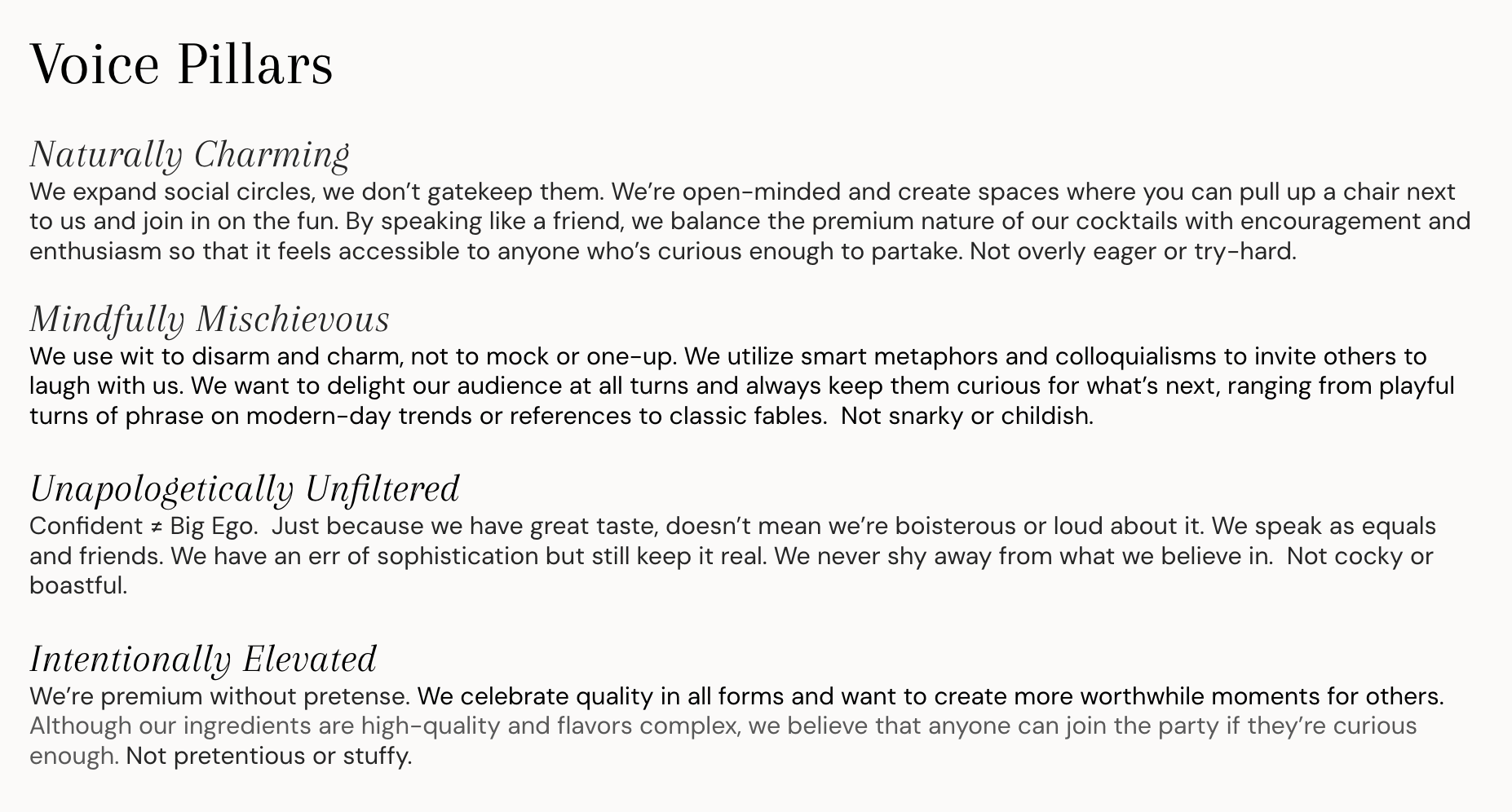 Premium, whimsical, witty, charismatic, welcoming but not overly friendly