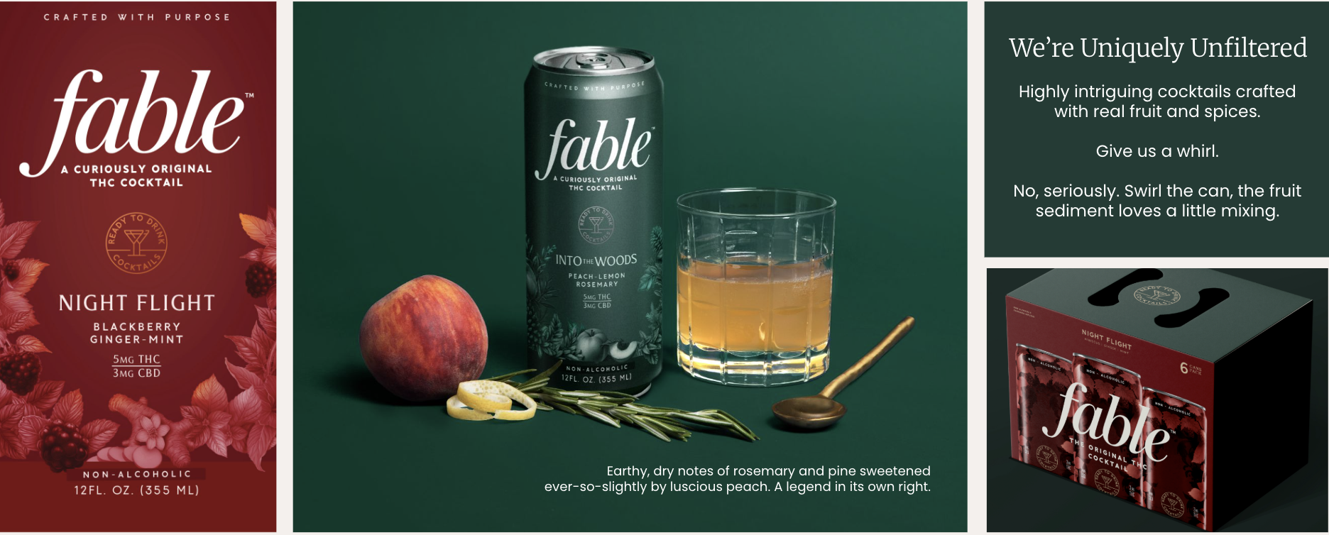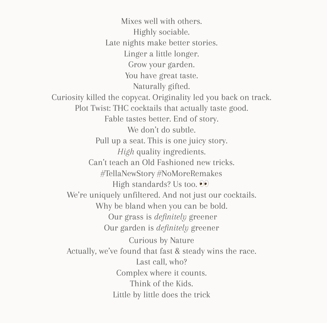 Not this can. This is a premium THC experience (wow, they do exist?!). Crafted with real fruit juices and the right amount of THC + CBD, Fable was able to achieve something unlike any of its copy-cat canned competitors: a real original cocktail. And a damn good one at that.